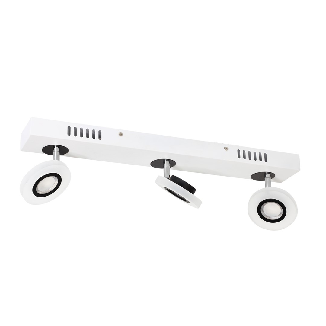PUNTO 022 to lampa sufitowa, która została przymocowana do podłużnej podsufitki za pomocą trzech regulowanych ramion, na których umieszczono trzy okrągłe oprawy z metalu. Obudowy mogą zostać umieszczone w odległości 16 cm od ściany. W tym modelu lampy można ustawić kąt padania światła w zależności od potrzeb użytkowników. W okrągłej oprawie pod akrylowym kloszem zamknięto energooszczędne moduły LED, których moc ma wartość 12 W, co odpowiada mocy 65 W w przypadku tradycyjnej żarówki. Źródło światła gwarantuje przyjemne dla oka światło, zbliżone do dziennego. Temperatura barwowa sięga 4000 K. Wartość strumienia świetlnego wynosi 560 lm.