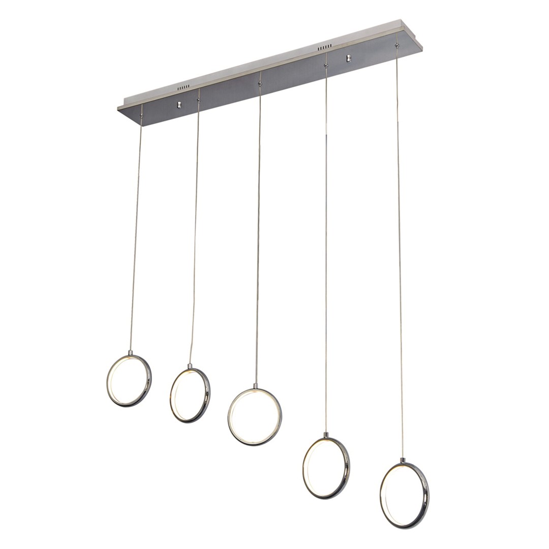 “Pięć wiszących chromowanych opraw to znak rozpoznawczy lampy firmy MiLAGRO z kolekcji Anello. W każdej z lamp zainstalowano na stałe moduł LED, których łączna moc wynosi 35 W, co odpowiada 175 W tradycyjnej żarówki. Wymiary lampy to: 85 cm długości i 10 szerokości, średnica każdej oprawy ma 12 cm. Ogromna zaletą Anello 272 jest możliwość dowolnej regulacji wysokości każdej oprawy z osobna na przewodzie do 90 cm. Strumień świetlny ma 1470 lm oraz przyjemną dla oka, neutralną barwę 4000 K.