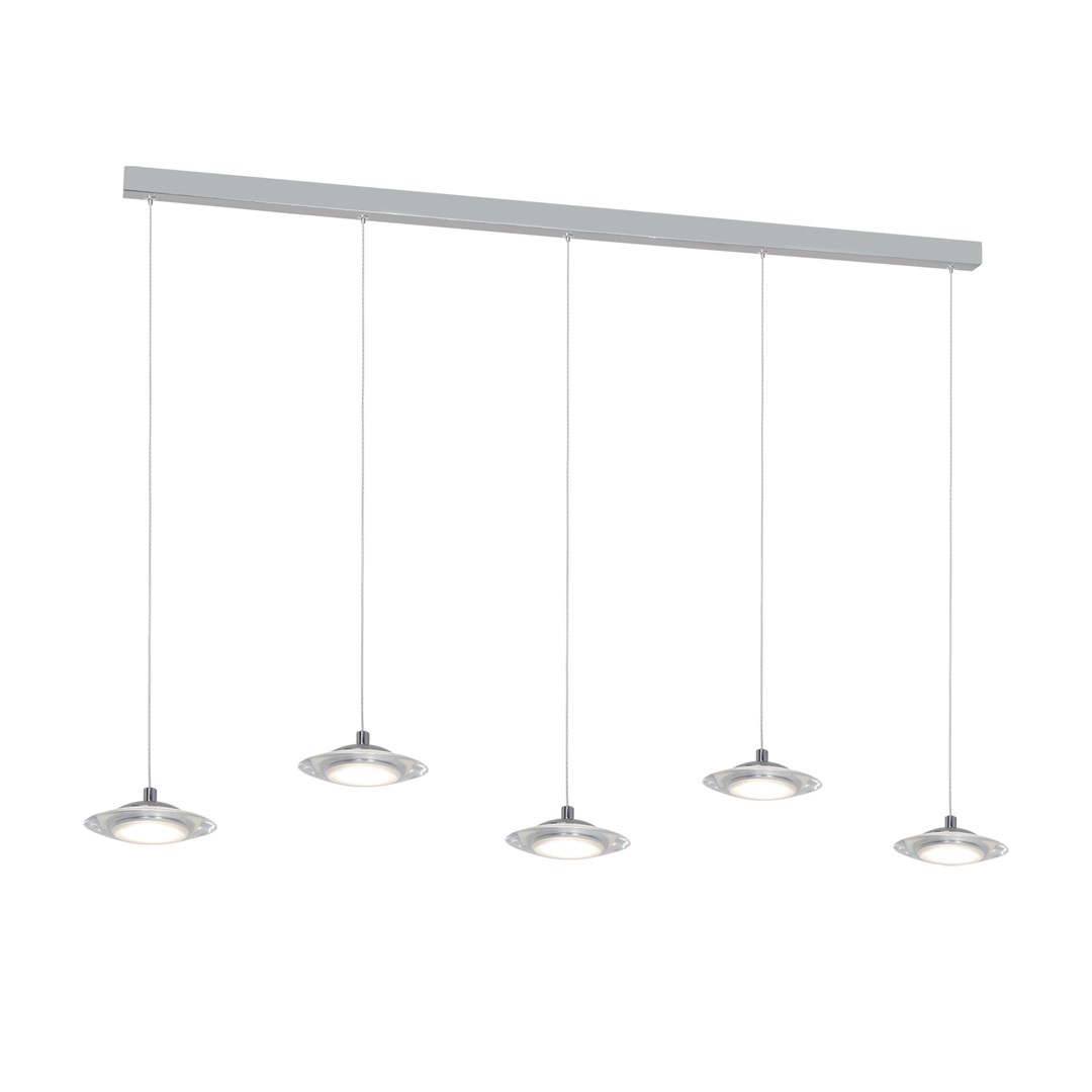 “Nowoczesna wisząca lampa LED jest połączeniem współczesnego wzornictwa, starannego wykonania oraz najlepszych materiałów. Posiada 5 punktów światła, które można dowolnie regulować od 40 do 100 cm wysokości. Łączna moc modułów LED to 25 W, które odpowiadają 126 W tradycyjnej żarówki. Do tego jasny strumień świetlny – 1750 lm o neutralnej białej barwie 4000 K. Szerokość elementu świetlnego to 80 cm, z kolei średnica każdego klosza wynosi zaledwie 12 cm. Lampę wykończono w eleganckim i stylowym chromie.