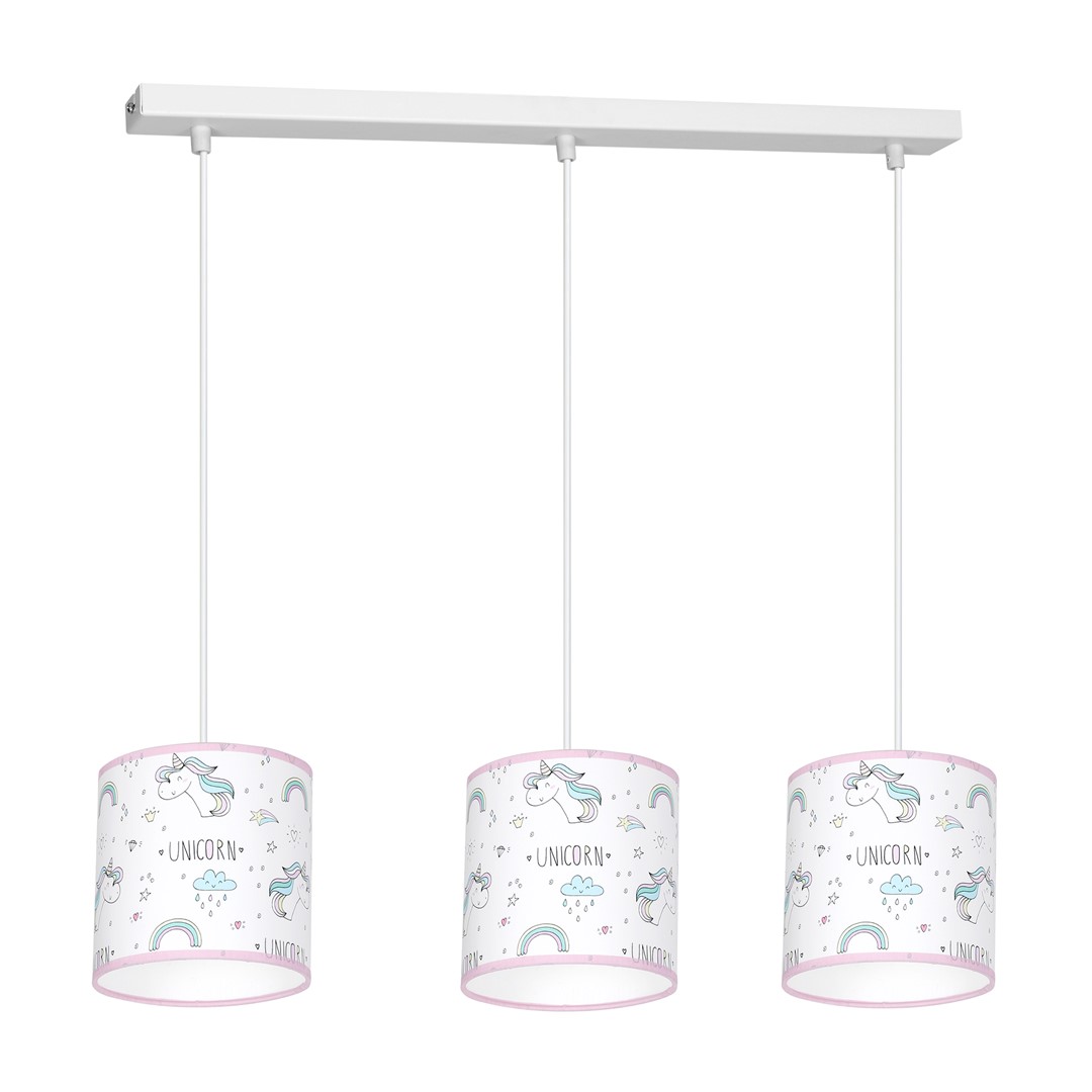 Dziecięca kolekcja UNICORN to seria lamp w różnych konfiguracjach. Wśród nich znaleźć możemy lampy sufitowe z jednym i trzema punktami światła na listwie, z trzema osobnymi kloszami oraz zwisające z listwy. Ponadto, wiszące lampy mają możliwość regulacji wysokości zwisu, dzięki czemu można dopasować je do wnętrz o różnych wysokościach. Elementem wyróżniającym produkty tej serii są wielokolorowe abażury z motywem jednorożca utrzymanym w pastelowej kolorystyce, które z pewnością zainteresują pasjonatki tych bajkowych stworów.