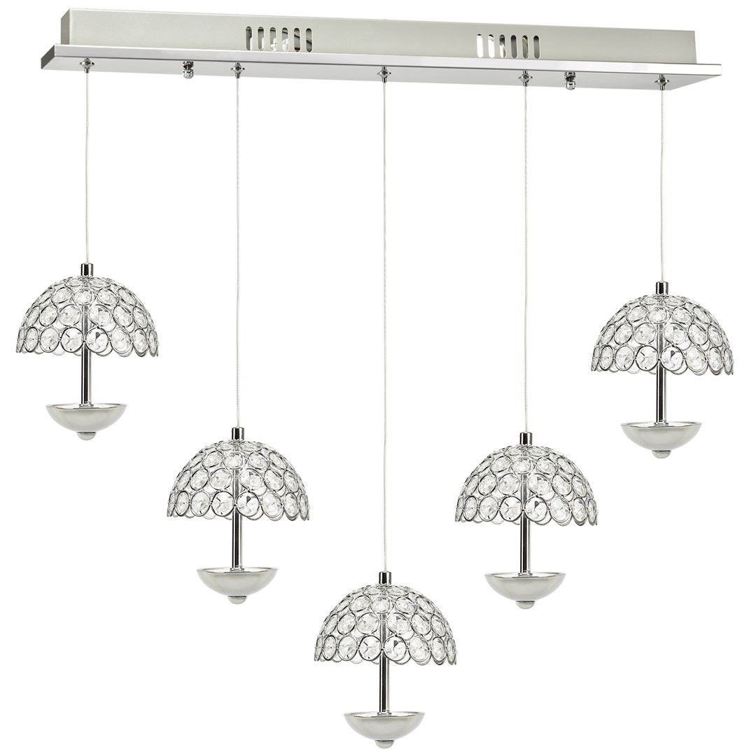 VENUS ML317 jest wiszącą lampą sufitową, którą można znaleźć w ofercie firmy MiLAGRO. Model ten posiada pięć szklanych, ażurowych kloszy z pięcioma modułami LED w komplecie. Moduły te są całkowicie wymienne, dzięki czemu lampa możemy cieszyć się przez wiele lat. Energooszczędne punkty świetlne osiągają moc 25 W, co odpowiada mocy 126 W w przypadku tradycyjnej żarówki. LED świeci przyjemnym dla oka, zbliżonym do dziennego światłem o temperaturze barwowej 4000 K. Strumień świetlny ma wartość 1750 lm. Ażurowe, szklane klosze o średnicy 12 cm każdy umieszczono na regulowanych zawiesiach o długości sięgającej 90 cm. Całość przymocowano do podłużnej podsufitki, która ma długość 64cm.